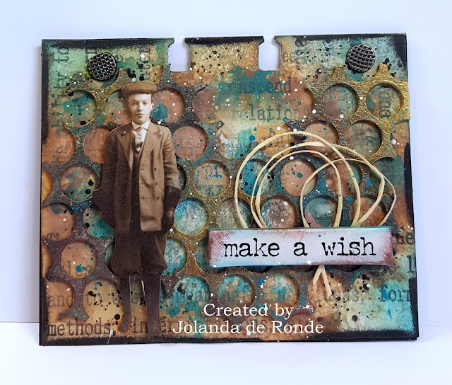 Ik heb heerlijk zitten spelen met verschillende materialen. Ben begonnen met het stempelen en daarna aan de slag gegaan met Distress oxide en heb Peakock feathers en Vintage Photo genomen. De rondjes die jullie zien is een stuk Dutch Doobadoo - Softboard Art - Dots - 478.007.009