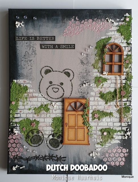 Ik heb de mask op het canvas gelegd en de mask ingesmeerd met de structuurpasta. Ik heb natuurlijk niet de gehele mask ingesmeerd. Want dan krijg je van de scherpe lijnen aan de kanten. Ik heb de mask wel zo neergelegd dat de rechte rechterlijn naast de deur kwam. Na het insmeren heb ik de structuurpasta gedroogd met een heattool. Na het drogen heb ik de deur erop gelegd zodat ik wist waar ik de mask weer moest neerleggen. Want nu heb ik de rechte linkerkant gebruikt voor aan de andere kant van de deur. Omdat ik de muur hoger wilde dan de mask is, heb ik ook voor de bovekant de rechte lijn aangehouden. Zo kun je gemakkelijk een muurtje verder "metselen". Voordat ik het muurtje verder heb gemetseld, heb ik ook nu weer de structuurpasta eerst gedroogd met de heattool. Om het raampje in het muurtje te plaatsen, heb ik het muurtje overgenomen op papier en deze achter de mask geplakt (eerst gekeken waar ik het raampje wilde, hierop het papiertje en toen de mask erop). Daarna opnieuw de mask ingesmeerd met de structuurpasta. Het mos dat je ziet op de stenen heb ik gemaakt met de Cadence Moss Light Green 3633 en Cadence Moss Dark Green 3640.