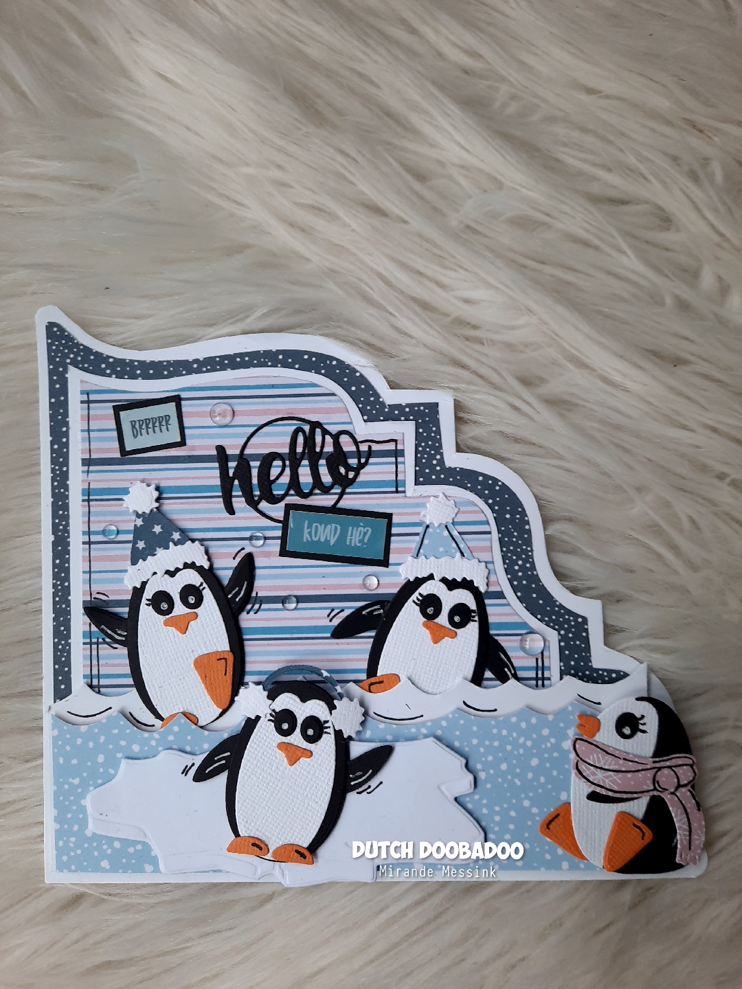 De pinguïns zijn gemaakt met een stans. De golfjes op de kaart heb ik gemaakt met de doosjes mal van Dutch Doobadoo. Zo zie je maar dat je verschillende mallen ook heel leuk met elkaar kunt combineren.