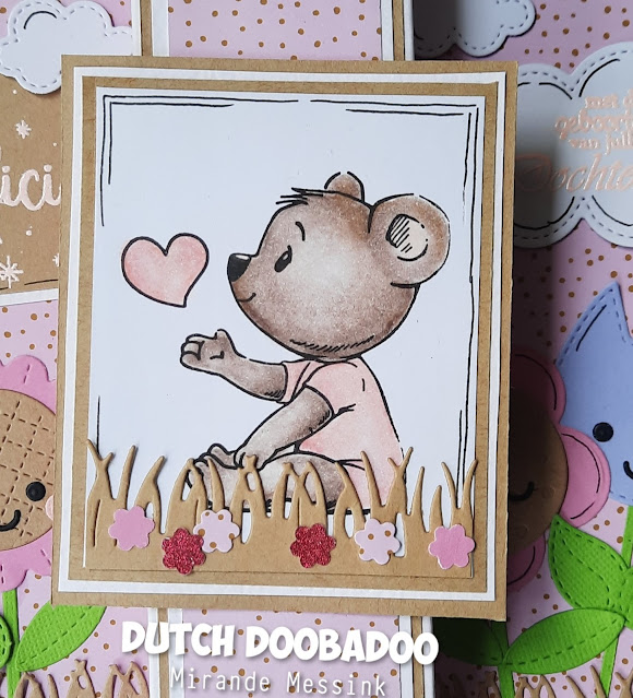 Aan de linker en rechterkant van de kaart heb ik bloemetjes verwerkt, die ik gemaakt heb met een stans van Carlijn/Jocelijne design. De grasrand he bik gemaakt met een stans en de kleine bloemetjes in het gras heb ik gemaakt met een pons. De teskt "proficiat" heb ik gestempeld met inkt waarna ik er roze emobossingpoeder overheen heb gestrooid. Nadat je het dan droogt met de heatgun ziet de tekst er zo uit. De wolkjes heb ik ook gemaakt met een nieuwe stans van Carlijn/Jocelijne design.
