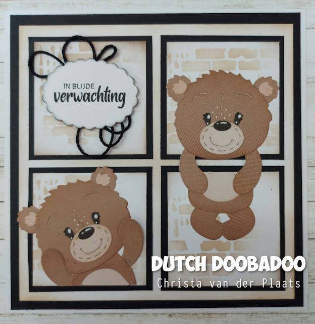 Tussen het raam heb ik over een spijl van het raam Ted gehangen. Deze is van Creative CraftLab ccl-fr-cd155. Links onderin heb ik er nog eentje gemaakt. Wat zijn ze toch leuk he! Verder heb ik de tekst "in blijde verwachting" van Creative Craftlab ccl-fr-stamp164 en de cutting dies ccl-es-cd158 gebruikt. Onder de tekst heb ik een stukje hempcord gebruikt.