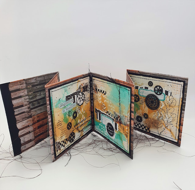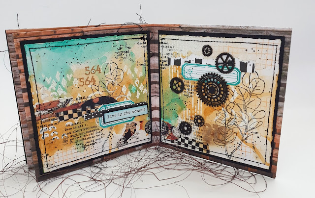 De pagina's heb ik verder afgemaakt met stempelafdrukken van etiketten, wat stukjes gescheurd dessinpapier. Om nog wat meer zwart terug te laten komen heb ik ook de greyboard tandwielen van Dutch Doobadoo gebruikt.