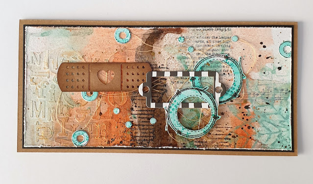 Dit is de kaart die ik met de gemaakte achtergrond maakte. Zoals je ziet, heb ik er een beterschapskaart van gemaakt. De pleister op deze kaart is een paper art pleister van Dutch Doobadoo.